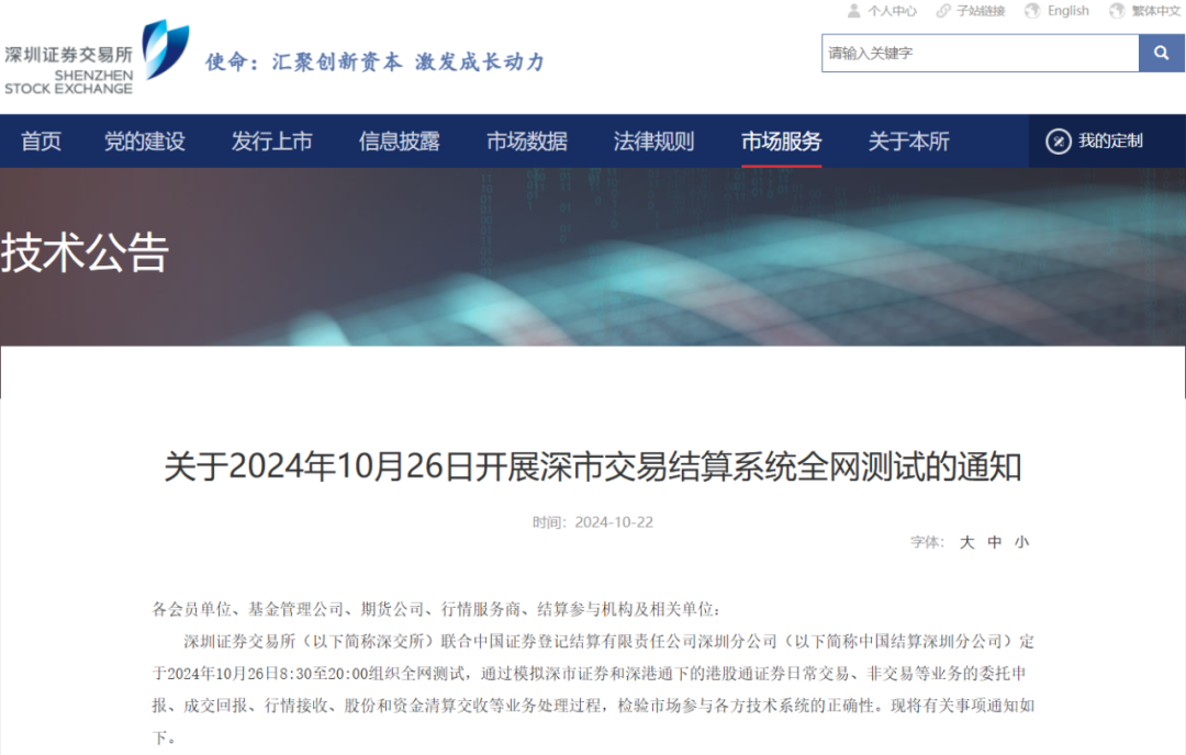 深交所发布通知,深圳证券交易所联合中国证券登记结算有限责任公司深圳分公司定于2024年10月26日8:30至20:00组织全网测试,通过模拟深市证券和深港通下的港股通证券日常交易、非交易等业务的委托申报、成交回报、行情接收、股份和资金清算交收等业务处理过程,检验市场参与各方技术系统的正确性。