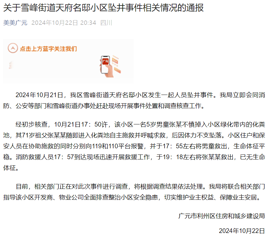 经初步核查,10月21日17:50许,该小区一名5岁男童张某不慎掉入小区绿化带内的化粪池,其71岁祖父张某某随即进入化粪池自主施救并呼喊求救,后因体力不支坠落。小区住户和保安人员在协助施救的同时分别向119和110平台报警,并于17:55左右将男童救出,生命体征平稳。消防救援人员17:57到达现场迅速开展救援工作,于19:18左右将张某某救出,已无生命体征。