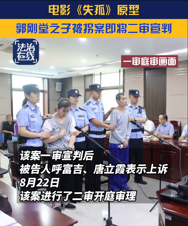 电影《失孤》原型郭刚堂之子被拐案,将于10月30日二审宣判。此前,该案一审宣判后,被告人呼富吉、唐立霞表示上诉。今年8月22日该案进行了二审开庭审理。