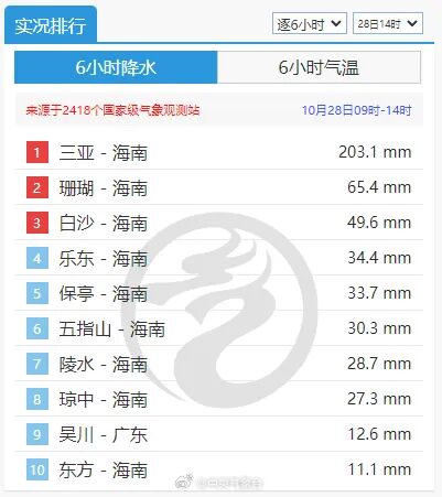 ▲截至10月28日14时,三亚市单小时降雨量位列全国排行榜第一。