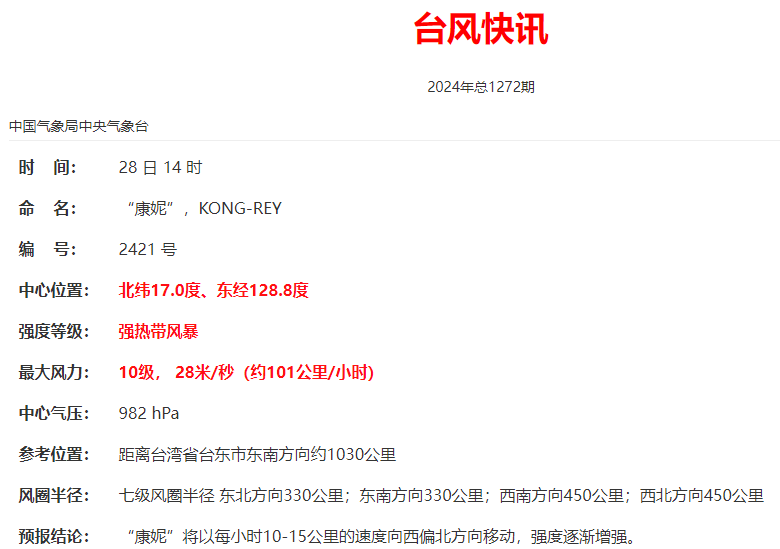 另一边,今年第21号台风“康妮”已于10月28日上午由热带风暴级加强为强热带风暴级。
