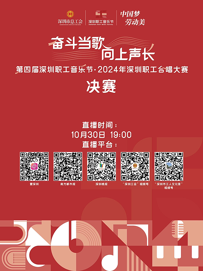 10月30日晚,“奋斗当歌 向上声长”深圳市第四届职工音乐节·2024年深圳职工合唱大赛决赛将在深圳大剧院大剧场举行,10支职工合唱队伍将现场竞演。