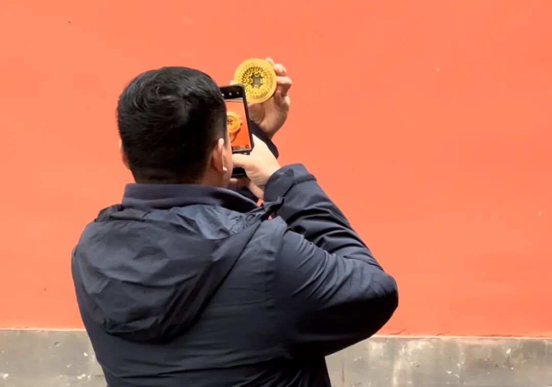 游客取到天宫藻井冰箱贴后立刻拍照。