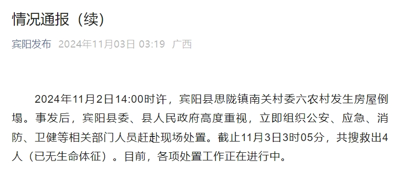 2024年11月2日14时许,宾阳县思陇镇南关村委六农村发生房屋倒塌。事发后,宾阳县委、县人民政府高度重视,立即组织公安、应急、消防、卫健等相关部门人员赶赴现场处置。截至11月3日3时05分,共搜救出4人(已无生命体征)。目前,各项处置工作正在进行中。