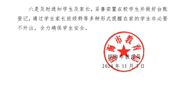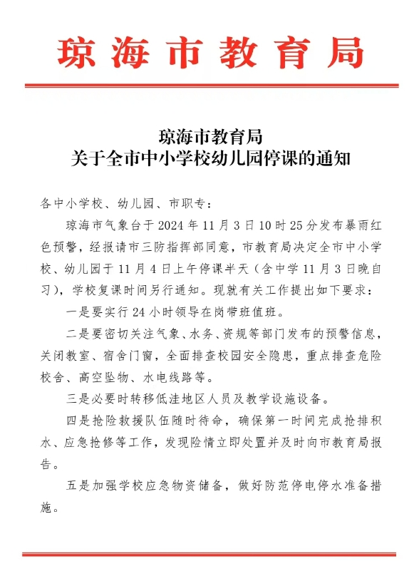 琼海市气象台于2024年11月3日10时25分发布暴雨红色预警,经报请琼海市三防指挥部同意,琼海市教育局决定全市中小学校、幼儿园于11月4日上午停课半天(含中学11月3日晚自习),学校复课时间另行通知。
