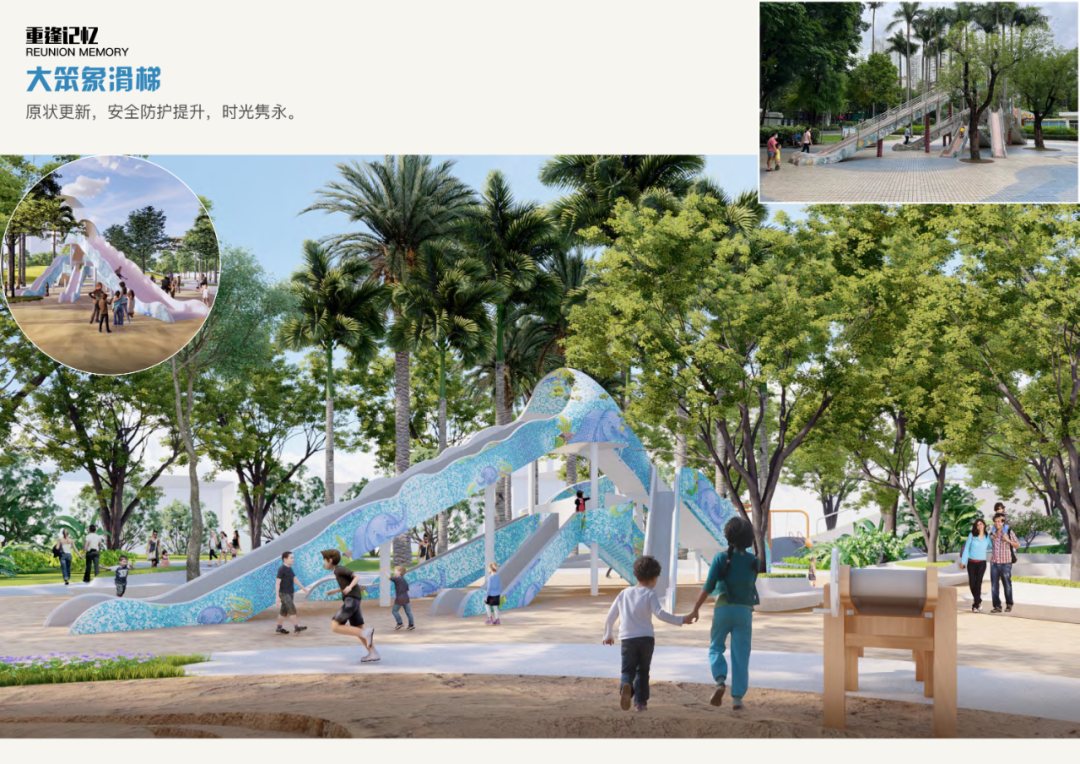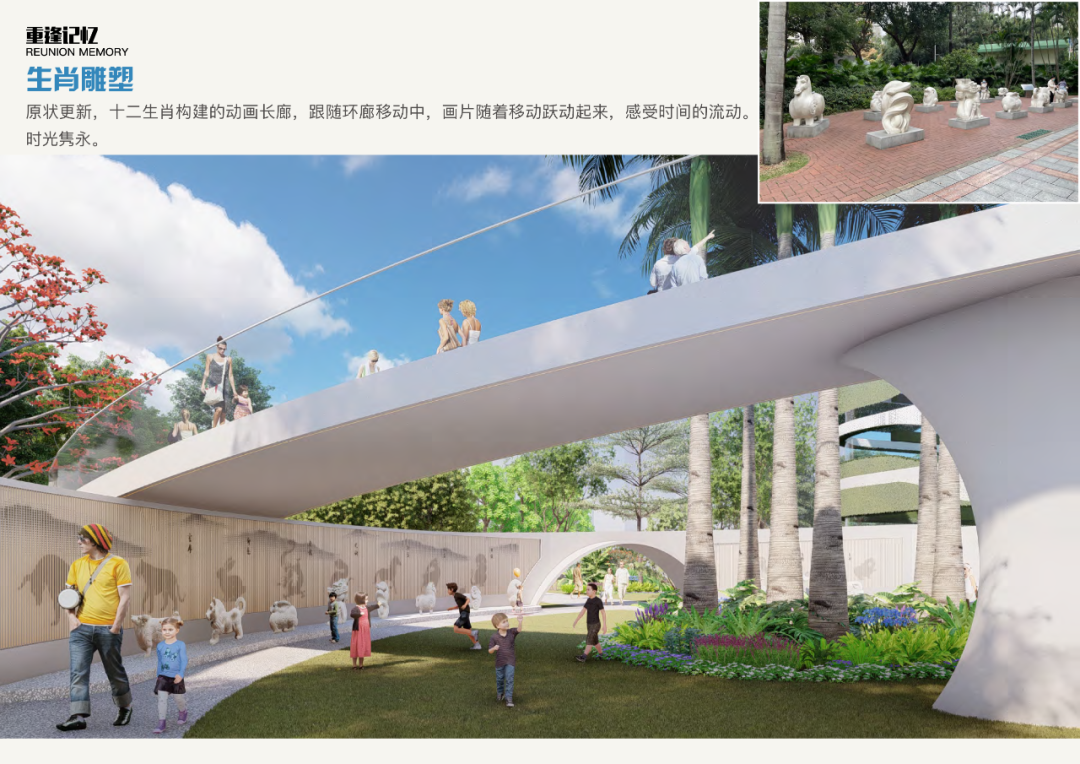 项目会保留并对大笨象滑梯、十二生肖雕塑等经典记忆区域进行提升改造。大笨象滑梯进行原状更新,优化外观、提升安全感,与沙坑区域融合,扩展亲子互动面积。十二生肖改造后放置在动画长廊前,结合有趣的摩尔效应,以此模拟时光的流逝。