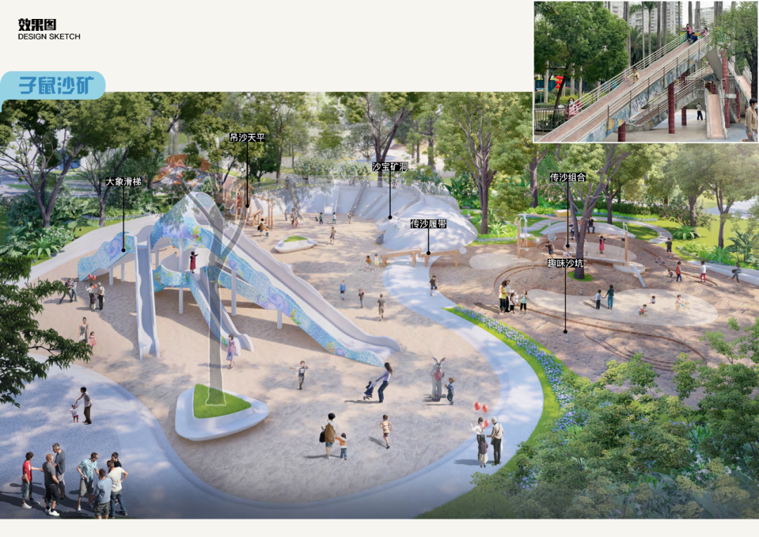 整体功能上按调研需求以玩沙、戏水、滑梯为关键元素,打造六大游戏分区。其中“子鼠沙矿”区域最具特色,能使静态的沙在场地中流动,加强儿童的创造力、社交合作等能力,打造“沙动力”乐园;借助樟树林区域构建冒险探索的森林探险乐园区,模拟小猴子蹦、爬、荡等行为动作,设置张力网、吊桥、树屋、滑索等冒险通道;模拟四季“云、雨、冰、雪”,布置水滑梯、水雾弹、跳泉等科技游戏,打造超能“水动力”乐园区;为避免排队拥挤,结合树荫分布设置单行往返活动游线,规划看护区、等候区,同时配备智能储物柜、洗脚池、直饮水点等服务功能。