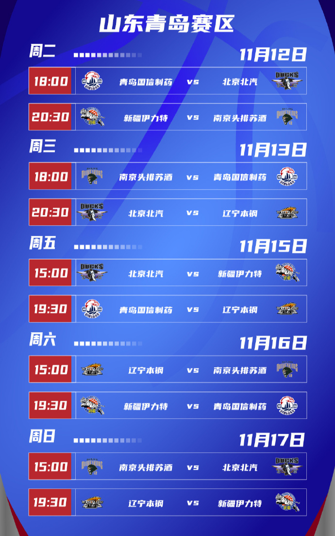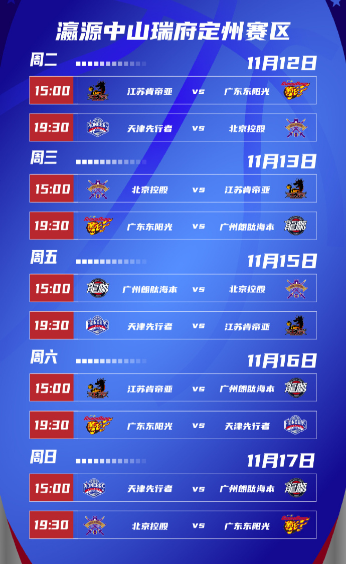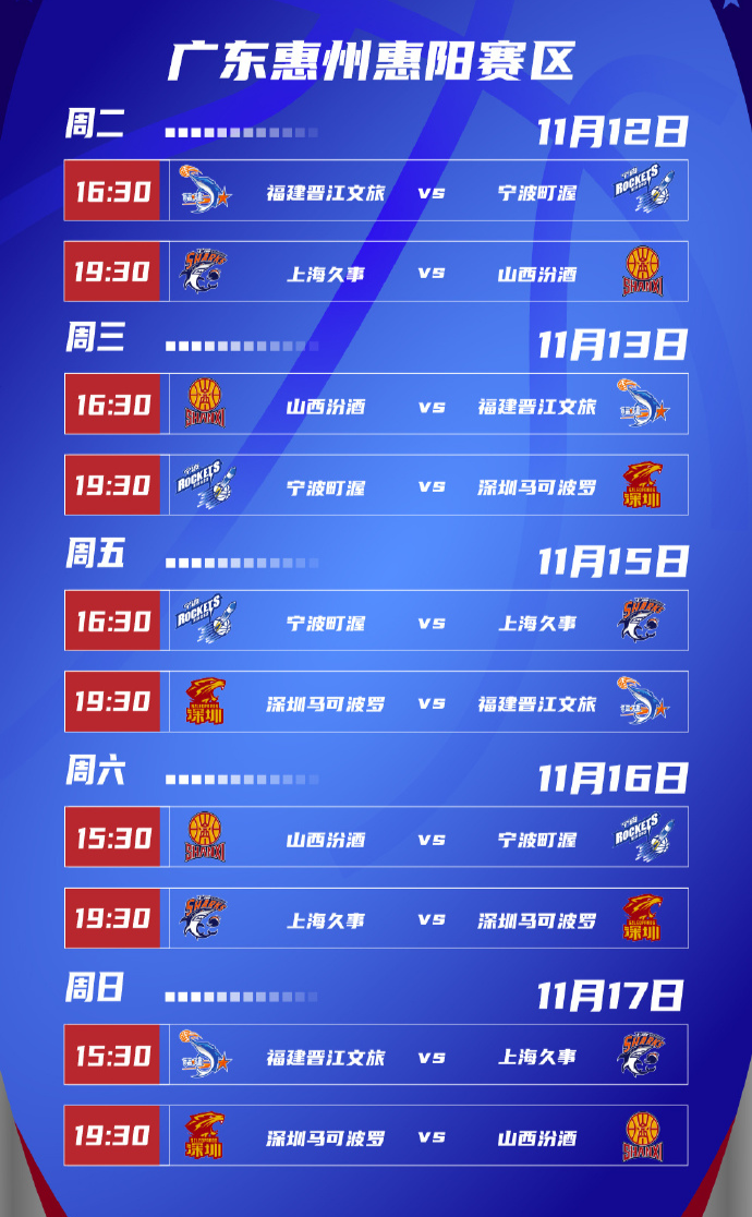 11月4日,CBA联赛官方公布首届CBA俱乐部杯赛程,比赛将于11月12日至11月17日进行第一阶段小组赛,四大赛区包括定州赛区、蓬莱赛区、惠阳赛区、青岛赛区