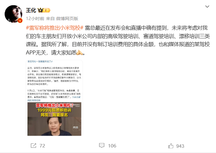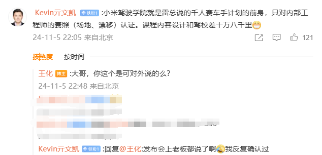 值得关注的是,在王化的微博下,小米集团@Kevin亓文凯 回复称:“小米驾驶学院就是雷总说的千人赛车手计划的前身,只对内部工程师的赛照(场地、漂移)认证。课程内容设计和驾校差十万八千里。”