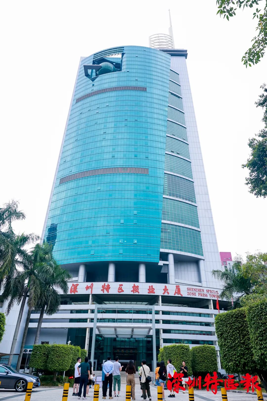 以蓝色为主色调的深圳特区报业大厦,形似一艘扬帆的巨舰大厦中上部那颗巨大的玻璃球体,寓意“新闻眼”。
