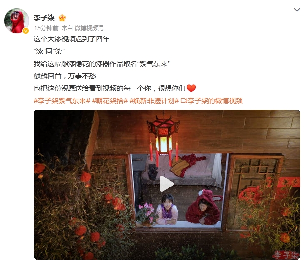 11月12日,李子柒发布视频,并称“这个大漆视频迟到了四年,‘漆’同‘柒’,我给这幅雕漆隐花的漆器作品取名‘紫气东来’,麒麟回首,万事不愁。也把这份祝愿送给看到视频的每一个你,很想你们。”