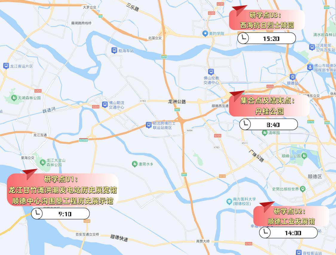 具体路线为龙江甘竹滩洪潮发电站历史展览馆、顺德中心沟围垦工程历史展示馆➔顺德工业发展馆➔西海抗日烈士陵园