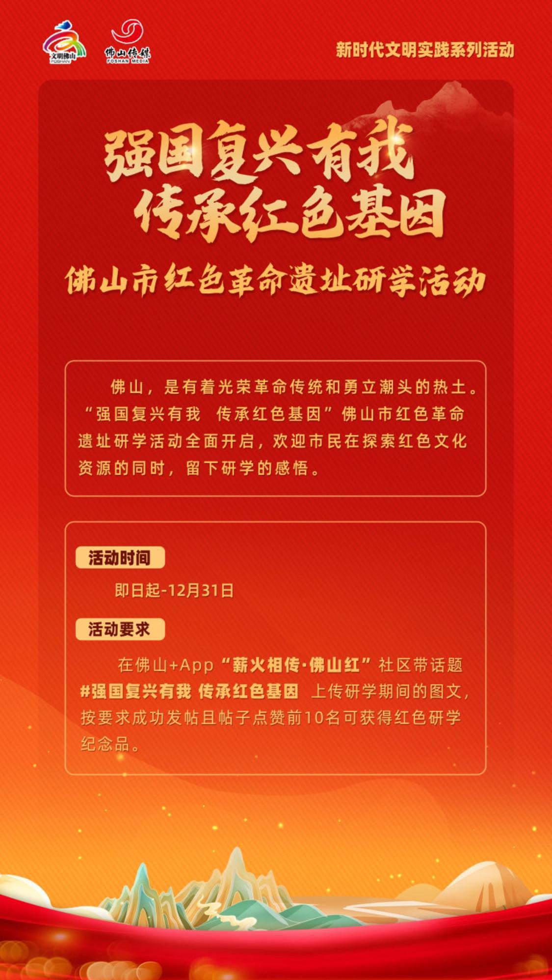 在佛山+App“薪火相传·佛山红”社区带话题# 强国复兴有我 传承红色基因 上传研学期间的图文,按要求成功发帖且帖子点赞前10名可获得红色研学纪念品。