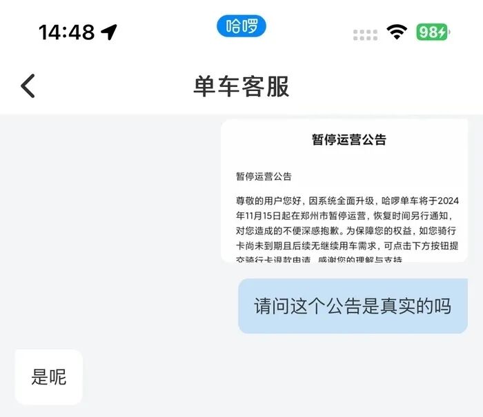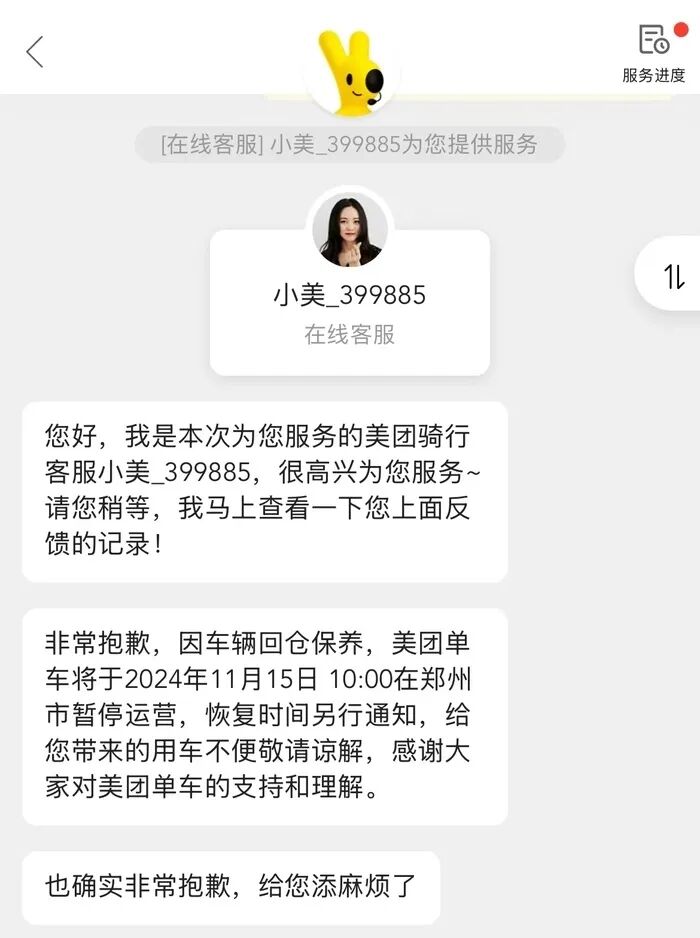 11月15日,从美团单车客服处了解到,因车辆回仓保养,美团单车将于2024年11月15日10:00在郑州市暂停运营,恢复时间另行通知。哈啰单车客服回应确认,因系统全面升级,哈啰单车将于2024年11月15日起在郑州市暂停运营,恢复时间另行通知。