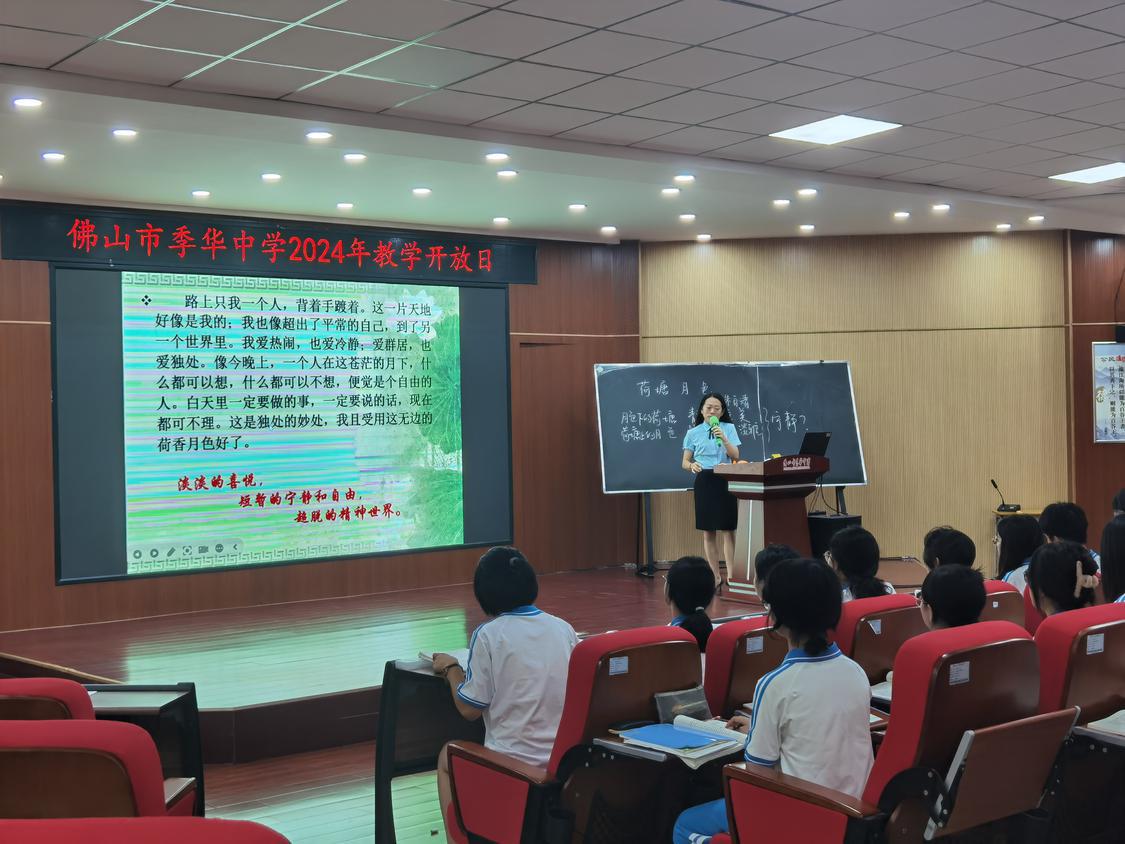 “请同学们选出你认为最贴合《荷塘月色》的画作。”“老师,我喜欢水墨画,我觉得第三幅画里傍晚的荷塘最有意境。”在经典名篇《荷塘月色》的语文公开课上,佛山一中语文教师杨宝祺以四幅风格不一的荷塘画作打开了同学们的话匣子,引导他们积极讨论。“这次教研活动对老师和学生而言都是一个很好的学习机会,我看到了不同的教学模块和教学方式之间的碰撞,对我的教学能力也有很大的提升。”杨宝祺认为,目前的语文教学主要围绕“立德树人”的核心任务展开,目的是提升学生的整体素养,要让他们真正认识到语文是可观、可感、可触的。