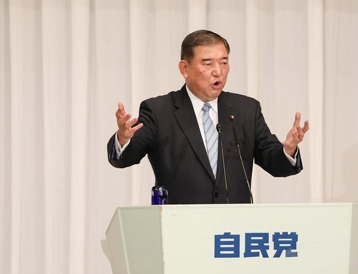 9月8日,在日本东京自民党总部,自民党总裁候选人石破茂发表演讲。 新华社记者 杜潇逸 摄