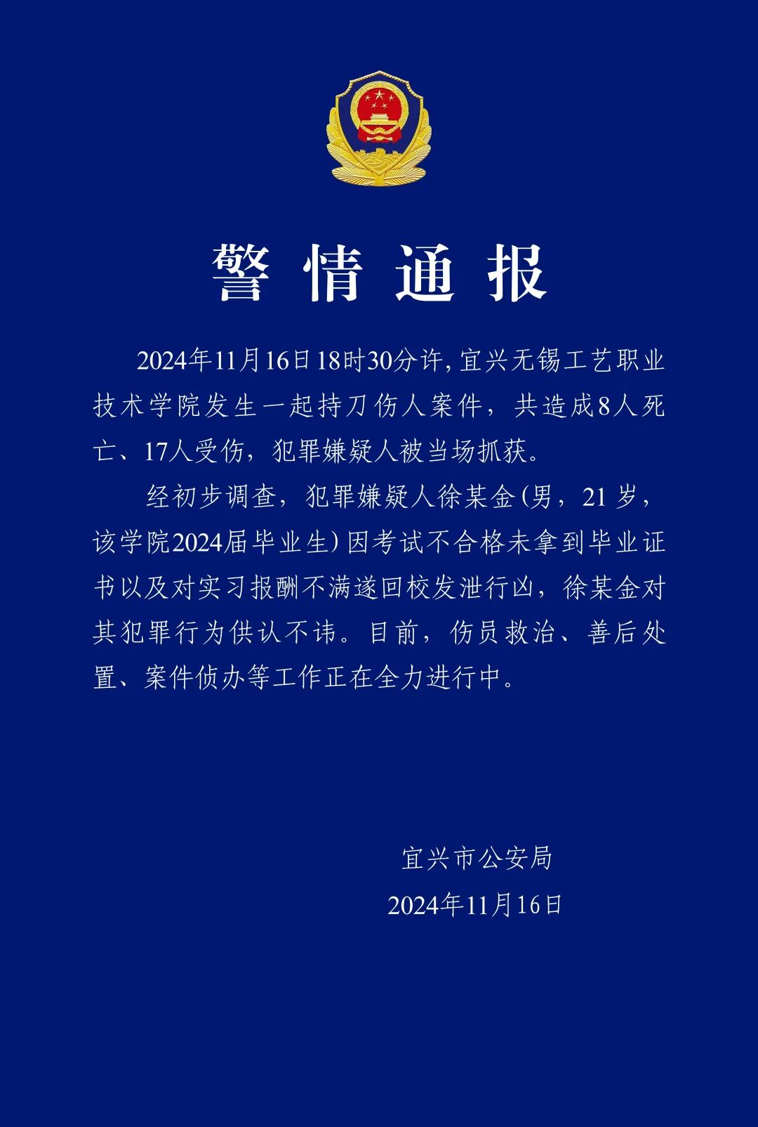 2024年11月16日18时30分许,宜兴无锡工艺职业技术学院发生一起持刀伤人案件,共造成8人死亡、17人受伤,犯罪嫌疑人被当场抓获。