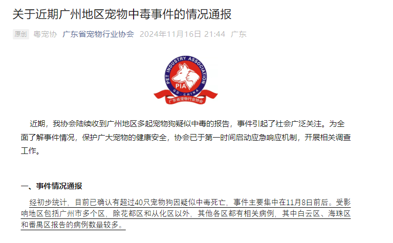 据广东省宠物行业协会11月16日晚消息,近期,省宠物行业协会陆续收到广州地区多起宠物狗疑似中毒的报告,事件引起了社会广泛关注。为全面了解事件情况,保护广大宠物的健康安全,协会已于第一时间启动应急响应机制,开展相关调查工作。