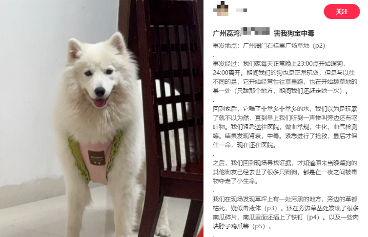 近日,有多位网友在社交媒体发帖称,在荔湾区彩虹街道一处草地遛狗后,爱犬疑似中毒。