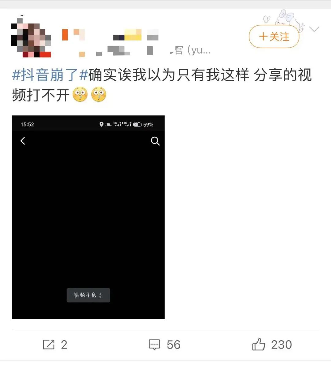不少网友在社交媒体平台上分享自己使用抖音出现问题的经历。有人表示,“分享的视频打不开,显示视频不见了”,还有人表示,“收藏记录、浏览记录都打不开”。