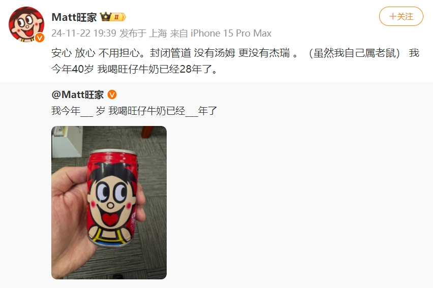 22日晚上,认证为“旺旺集团首席营运官”的微博账号@Matt旺家(旺旺集团创始人蔡衍明的二儿子蔡旺家)发布回应:安心 放心 不用担心。封闭管道没有汤姆更没有杰瑞。(虽然我自己属老鼠)我今年40岁 我喝旺仔牛奶已经28年了。