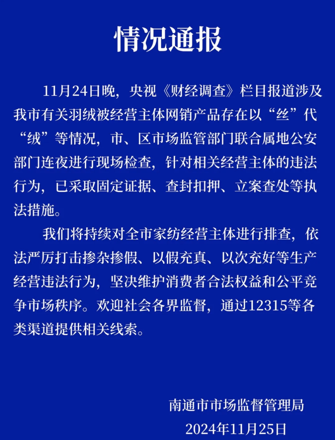 11月25日,江苏省南通市市场监督管理局发布一则情况通报称,11月24日晚,央视《财经调查》栏目报道涉及南通市有关羽绒被经营主体网销产品存在以“丝”代“绒”等情况,市、区市场监管部门联合属地公安部门连夜进行现场检查,针对相关经营主体的违法行为,已采取固定证据、查封扣押、立案查处等执法措施。