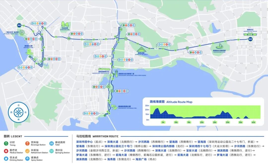 本届深马跨越福田、南山、宝安、前海四大区域,将途经市民中心、锦绣中华民俗村、世界之窗、深圳湾体育中心、深圳湾公园、大沙河生态长廊、南头古城、前海石公园等一批最具深圳特色的“城市名片”。