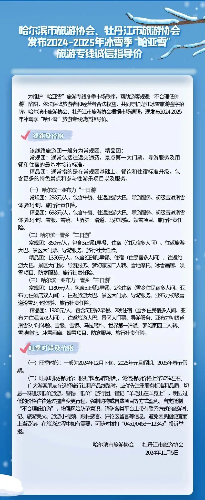 为维护“哈亚雪”旅游专线冬季市场秩序,帮助游客规避“不合理低价游”陷阱,依法保障旅游者和经营者合法权益,共同守护龙江冰雪旅游金字招牌,哈尔滨市旅游协会、牡丹江市旅游协会根据市场调研,现发布2024-2025年冰雪季“哈亚雪”旅游专线诚信指导价。详情如下↓