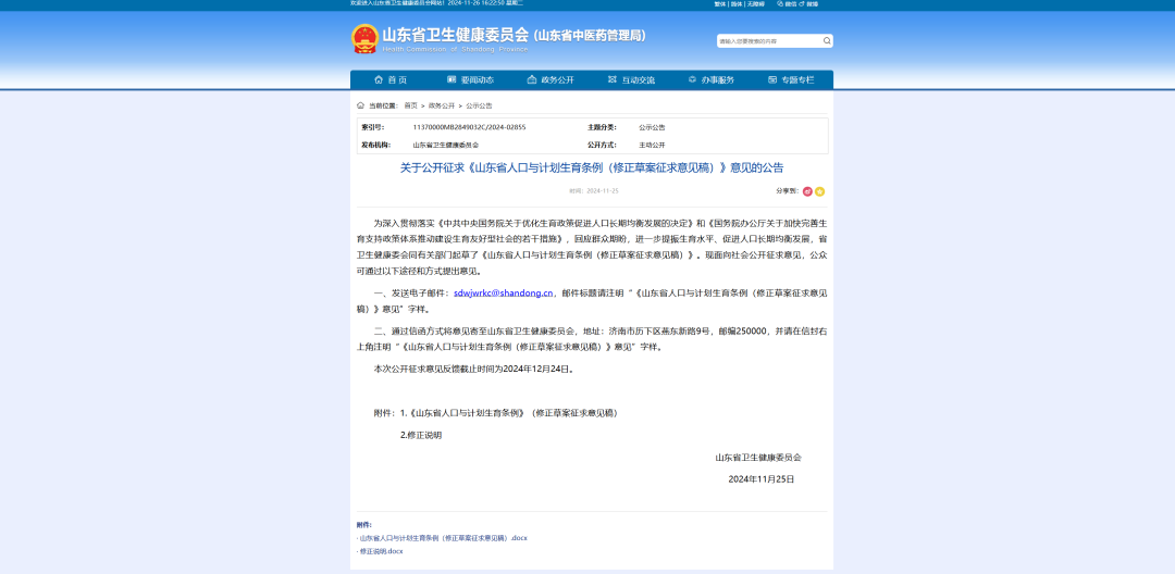 日前,山东省卫生健康委员会发布关于公开征求《山东省人口与计划生育条例(修正草案征求意见稿)》意见的公告。