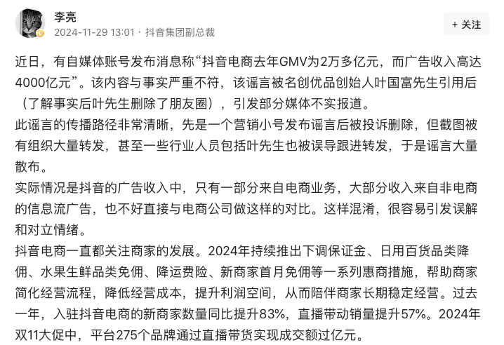 对此,抖音集团副总裁李亮在今日头条发布消息表示,该内容与事实严重不符。