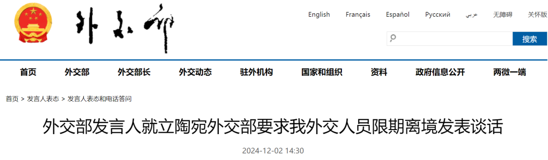 11月29日,立陶宛外交部在毫无理由的情况下,宣布将中国驻立代办处有关外交人员列为“不受欢迎的人”,要求限期离境。中方对此粗暴挑衅行径表示强烈谴责和坚决反对。