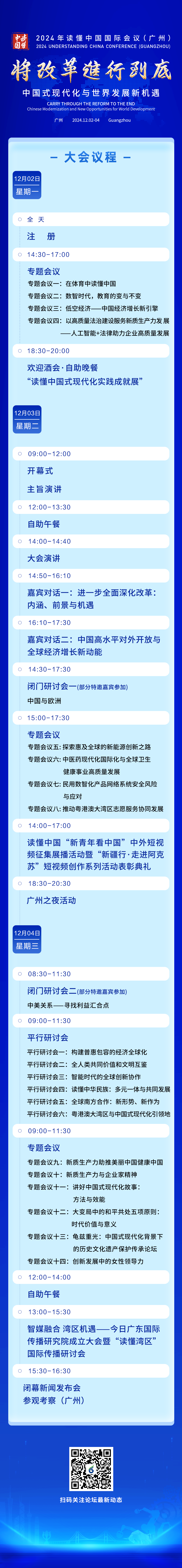 2024年“读懂中国”国际会议(广州)于12月2日-4日在广州市举行。会议围绕“将改革进行到底——中国式现代化与世界发展新机遇”这一主题,以习近平总书记关于中国式现代化的重要论述为指引,立足解读党的二十届三中全会精神,传播好中国式现代化对推动世界现代化进程、推动构建人类命运共同体的价值与意义;解读好进一步全面深化改革,推进中国式现代化的时代命题;广泛宣介中国式现代化的鲜明特色和丰富内涵;面向全球推介粤港澳大湾区的活力与魅力。帮助国际社会更好地读懂中国,读懂中国共产党,读懂中国式现代化。