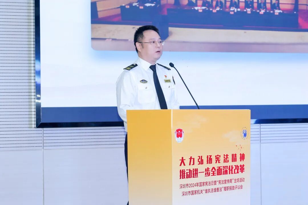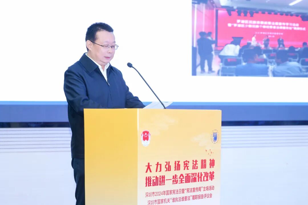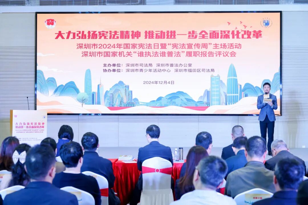 为全面推动全市深入学习宪法,深入推进法治深圳建设,12月4日,市司法局、市普法办在深圳市青少年活动中心举办深圳市2024年国家宪法日暨“宪法宣传周”主场活动、深圳市国家机关“谁执法谁普法”履职报告评议会。市委常委、政法委书记、依法治市办主任张礼卫出席此次活动,市司法局负责同志和市级各普法责任单位、各区司法局、大鹏新区政法和社会工作局、深汕特别合作区党政办等负责同志参加。