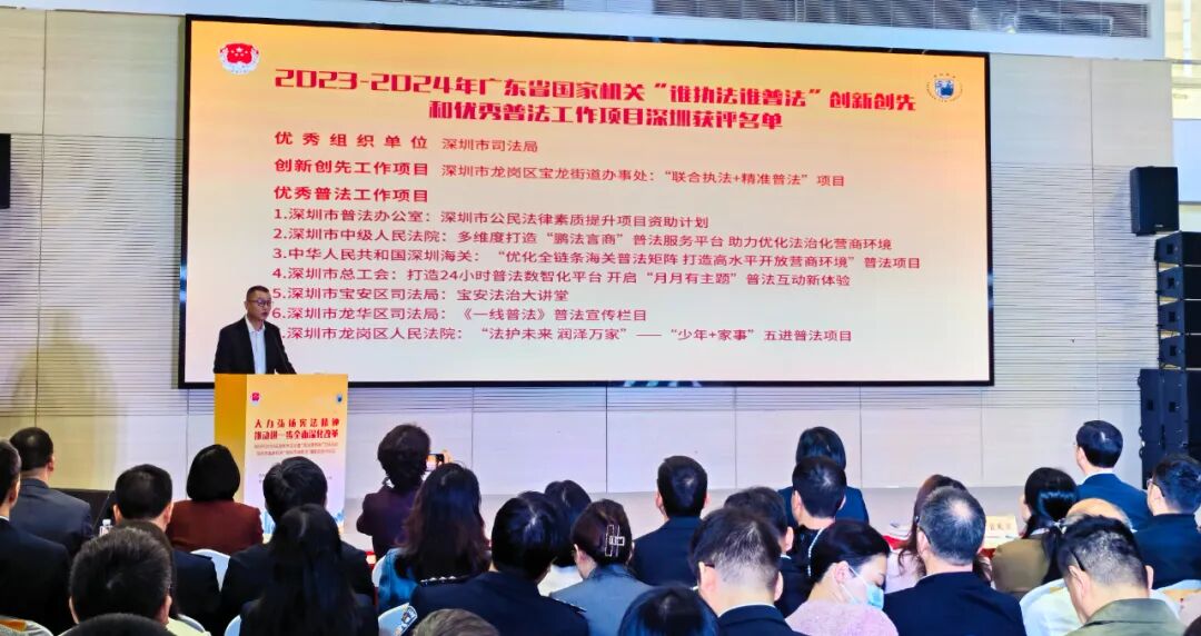 活动现场,市司法局、市普法办通报了全国“八五”普法中期深圳市获表扬单位和个人名单,以及2023-2024年广东省国家机关“谁执法谁普法”创新创先和优秀普法工作项目深圳获评名单,对部分2024年新遴选的“八五”基层普法联系点进行授牌,并回顾了2024年深圳市贯彻落实全民守法普法工作情况。