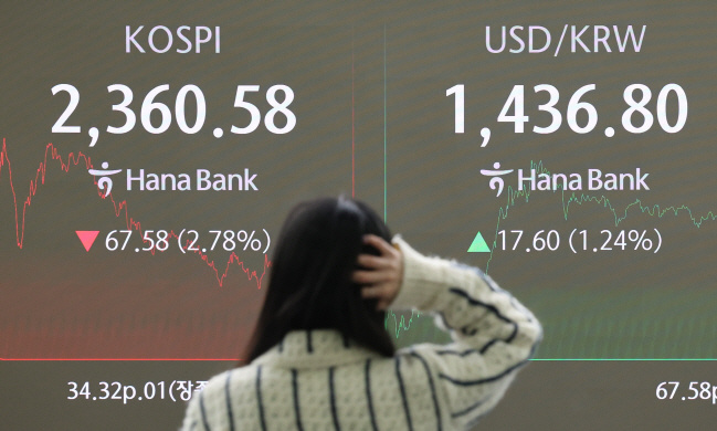 当天,韩国综合股价指数(KOSPI)比前一个交易日下跌2.78%,以2360.58点收盘;盘中一度跌至2360.18点,创下了自2023年11月3日以来的最低值。