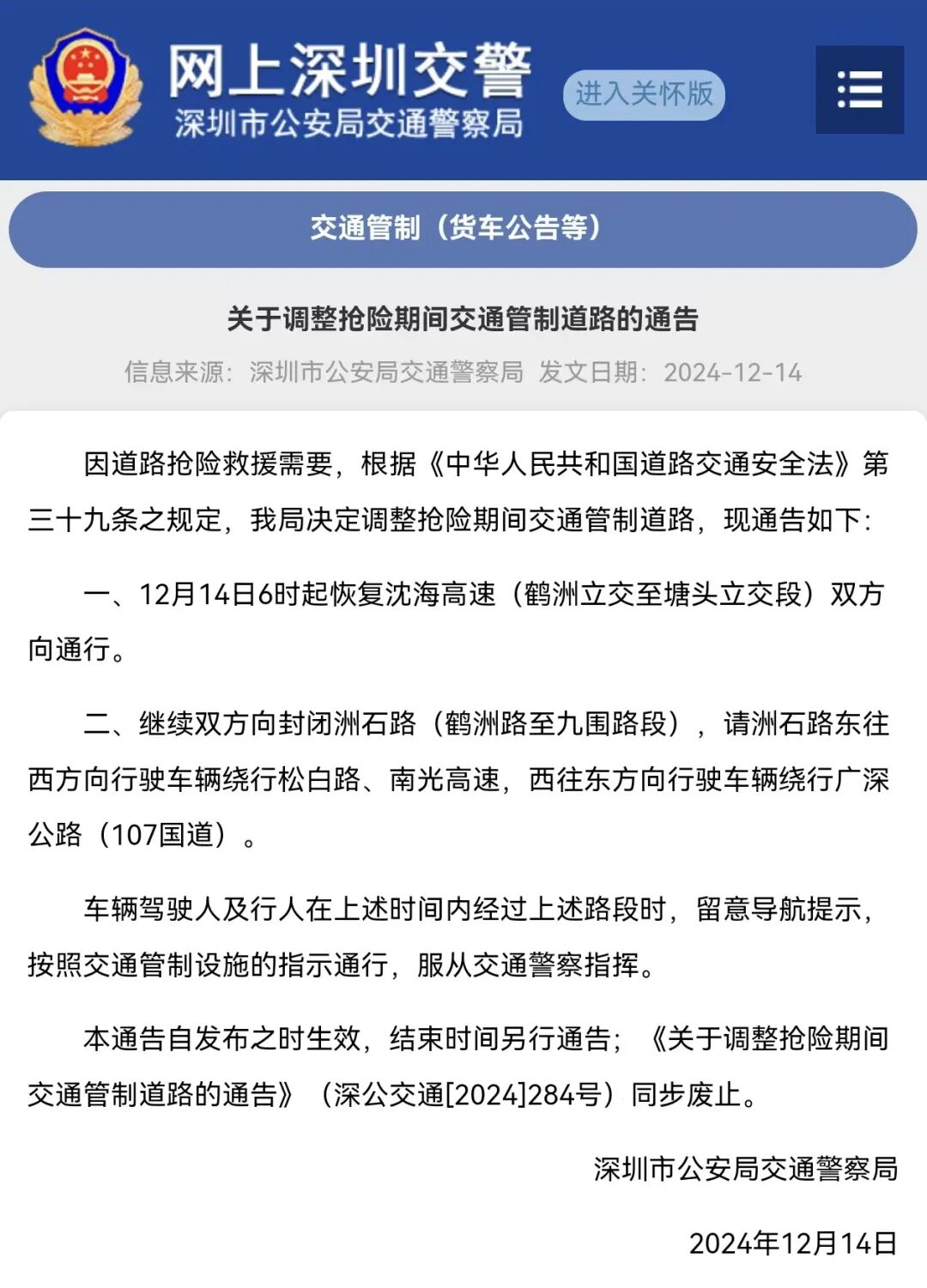 深圳交警发布通告
