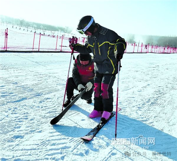 志愿者给游客穿戴雪具。