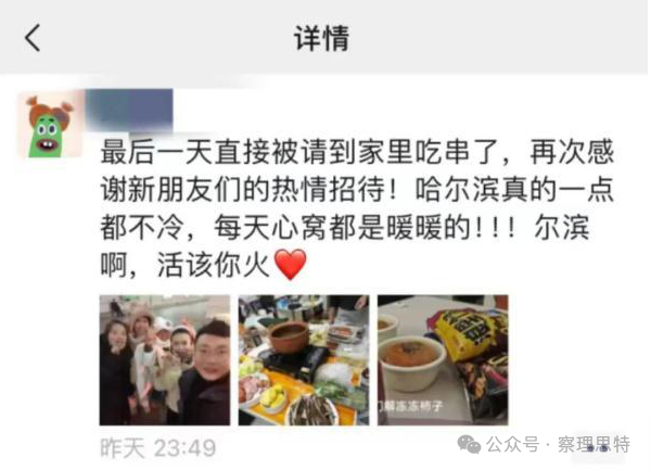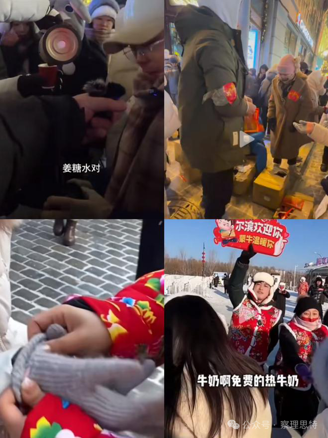 于是乎,自去年爆火以来,网络上流传着数不清的有关“热情尔滨人”的佳话:在冰天雪地的街头,有热心的市民小姐姐带着熬好、分装好的姜糖水,面向游客免费发放;有人携家带口免费派发暖宝宝,只为让游客游玩体验更舒适;有市民见游客来哈尔滨没带手套,不带一丝犹豫地将自己的手套脱下,亲手给对方戴上……