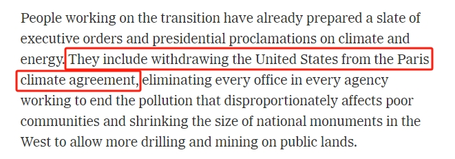 《纽约时报》11月8日援引消息人士的话报道称,特朗普的过渡团队已准备了一系列关于气候和能源的行政命令和公告,其中包括再次让美国退出《巴黎协定》。