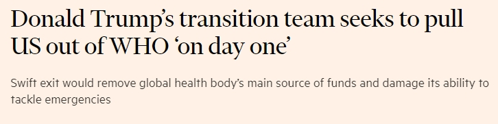贾阿认为,特朗普团队中也有一些人希望美国留在世卫组织并推动改革,但团队里持反对意见的人在争论中占了上风。贾阿说,“很多即将进入政府核心圈的人不信任世卫组织。他们希望在特朗普就任首日象征性表明他们退出这一组织。”