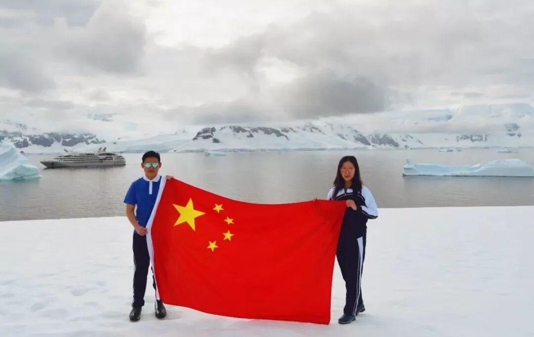 2019年,姚静母子登陆南极大陆,身穿深圳校服展示五星红旗。