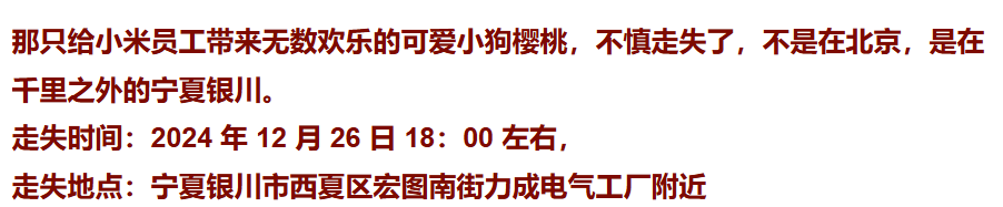 该篇文章提到,“那只给小米员工带来无数欢乐的可爱小狗樱桃,不慎走失了,不是在北京,是在千里之外的宁夏银川。”
