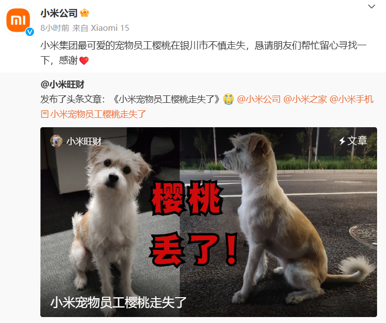 12月30日晚,@小米公司 发布一条求助博文,称“小米集团最可爱的宠物员工樱桃在银川市不慎走失,恳请朋友们帮忙留心寻找一下,感谢。”并转发了认证为“小米公司首席萌宠”的账号@小米旺财 的一篇《小米宠物员工樱桃走失了》。