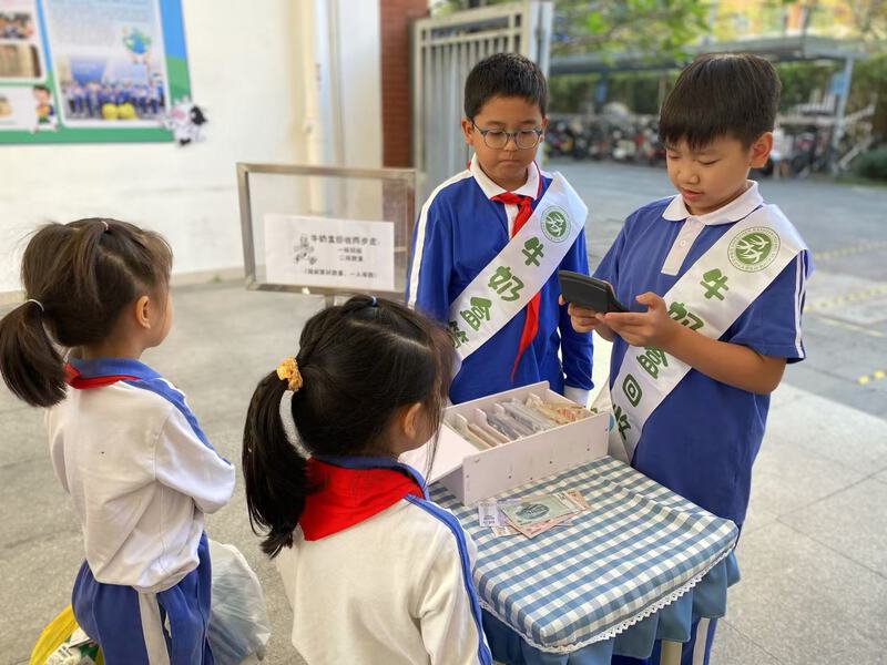 如何让牛奶盒回收行动可持续发展?荔香学校将其与学校财经素养课程相结合。学校设有“荔香少年梦想银行”,发行“荔香币”,每回收一个奶盒可以兑换0.5元荔香币,荔香币又可以购买其他奖品。