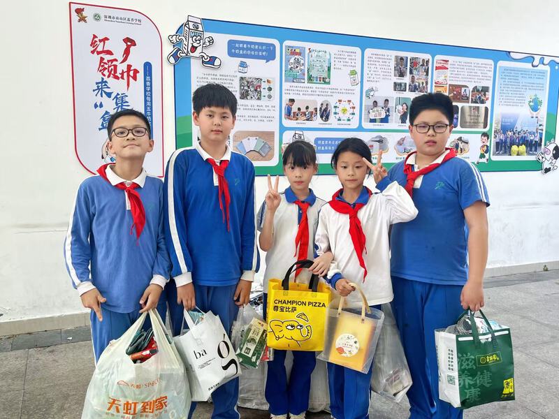 2023年3月8号,荔香学校教务主任赵建瑜清楚地记得学校第一次开展牛奶盒回收活动的时间。此后的每周五下午,学校食堂旁边都会支起长桌,由学生担任的“牛奶盒回收官”负责检查各班提前收集好的牛奶盒是否达标并进行登记。收集完成后,赵建瑜在“深分类”小程序进行预约,等待回收专用车将牛奶盒运走进行专业处理。如今,荔香学校已经收集了20多万个牛奶盒,约2.8吨,相当于少开采8棵10年大树、1.68吨原油和16.8吨铝矿。