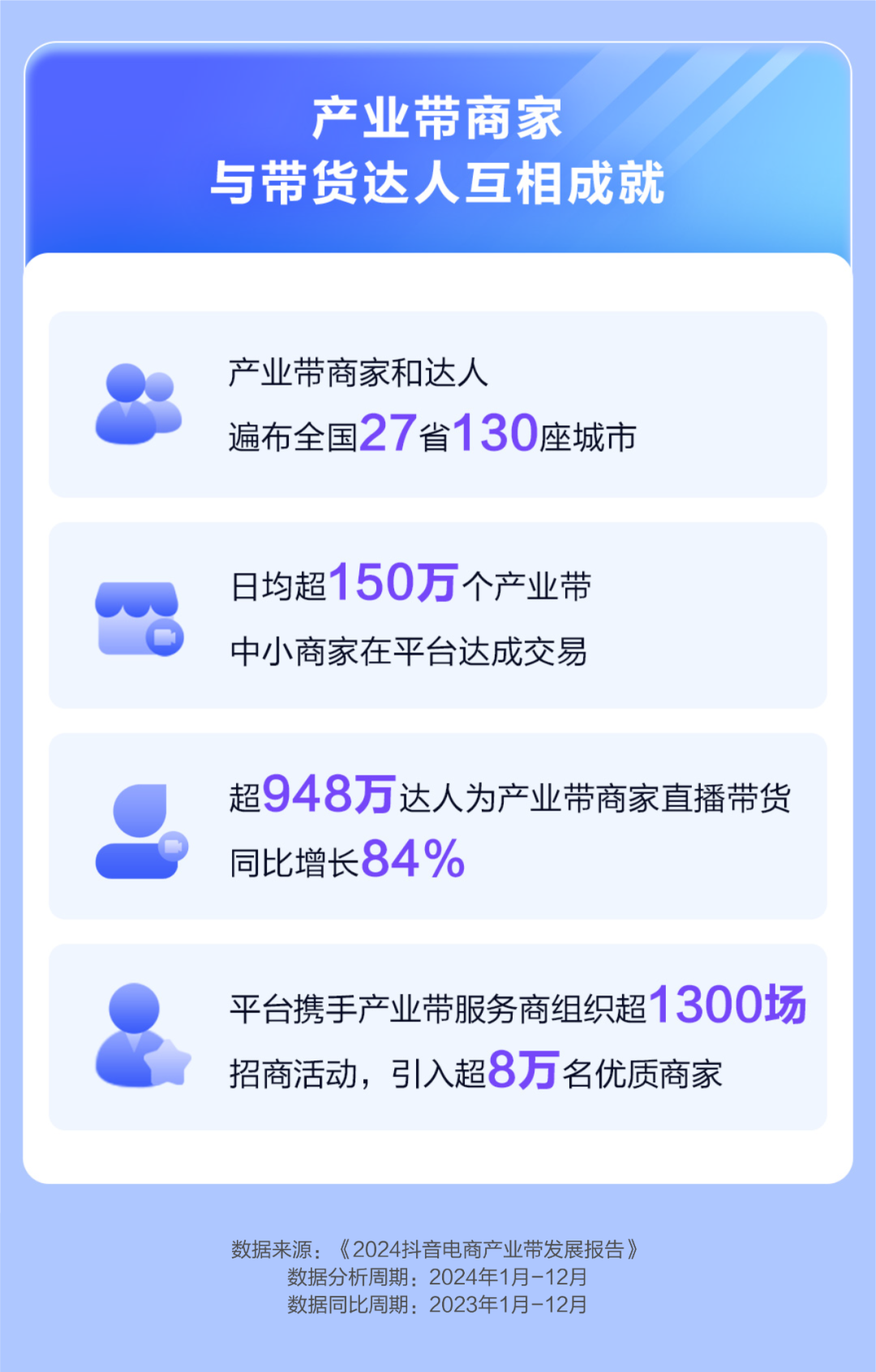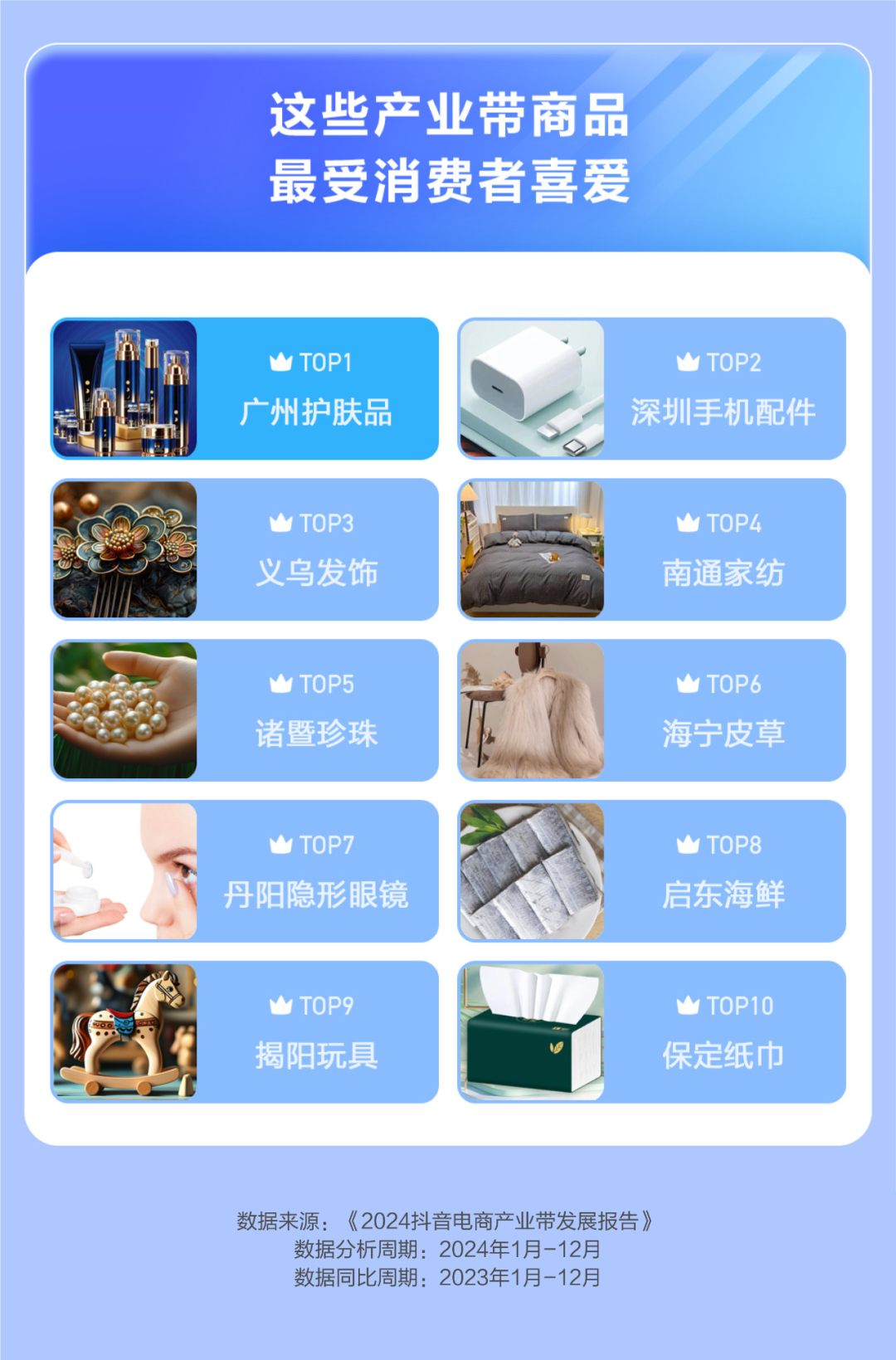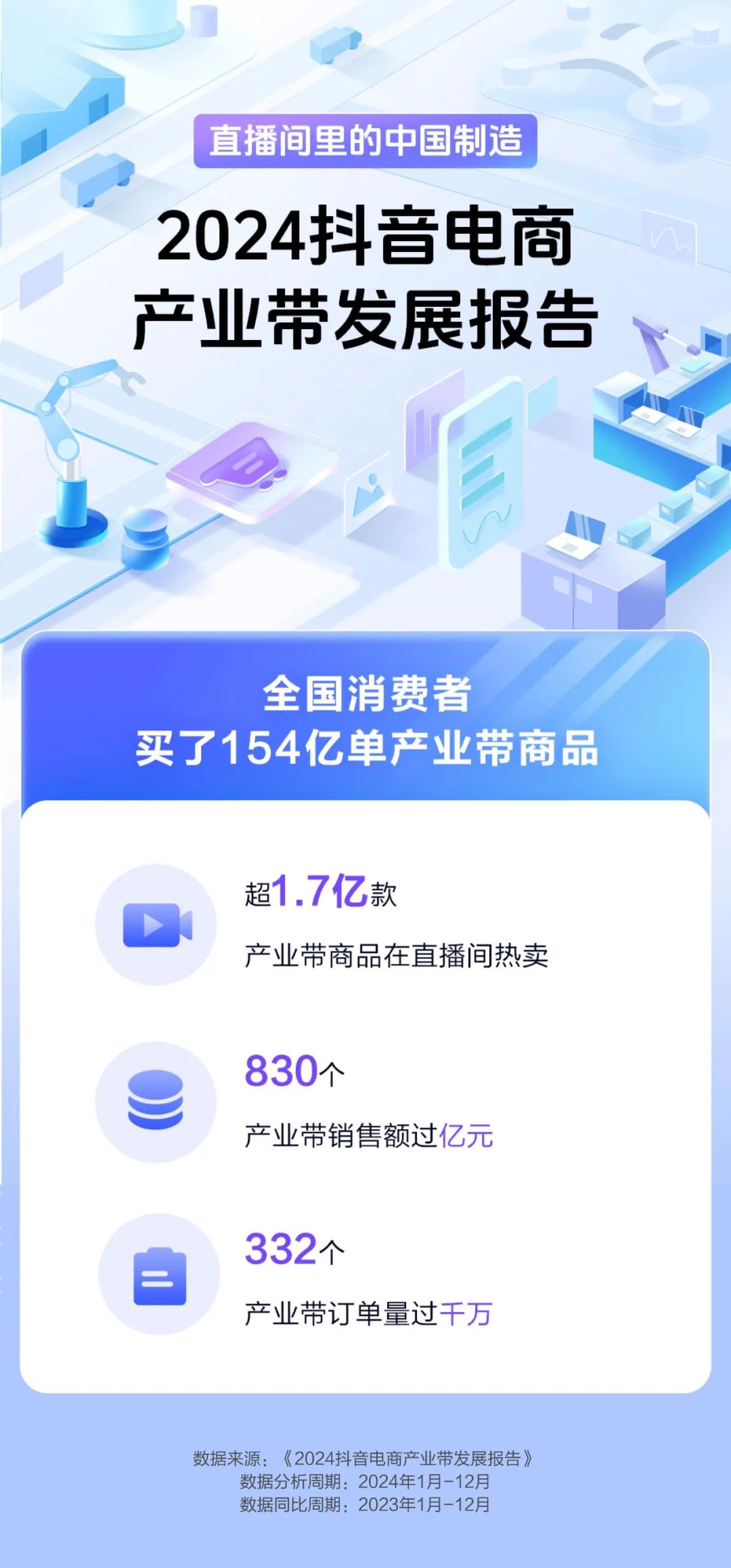 2024年12月31日,抖音电商发布《直播间里的中国制造——2024抖音电商产业带发展报告》,全面盘点2024年全国产业带地区实体经济和中小商家在该平台的发展情况。