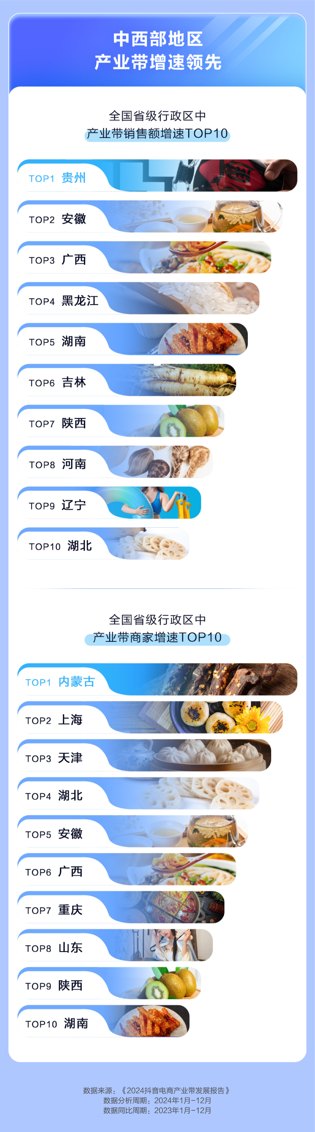 西部地区产业带进步明显,云南是产业带销售额和商家数量均进入全国前十的唯一西部省份,贵州的销售额增速全国第一,内蒙古的商家增速全国第一。广西和陕西的产业带销售额增速均进入全国前十,重庆的商家增速进入前十。
