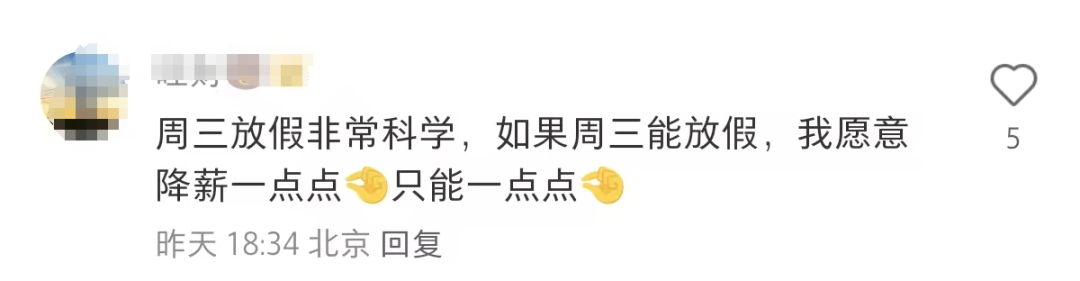 还有网友表示,周三放假非常科学,如果周三能放假,自己愿意降薪一点点,不过也只能一点点。