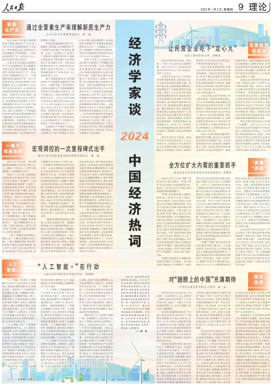 1月2日,《人民日报》理论版整版刊发《经济学家谈2024中国经济热词》,梳理总结过去一年与中国经济密切相关的高频词,并邀请多位专家学者解读剖析。
