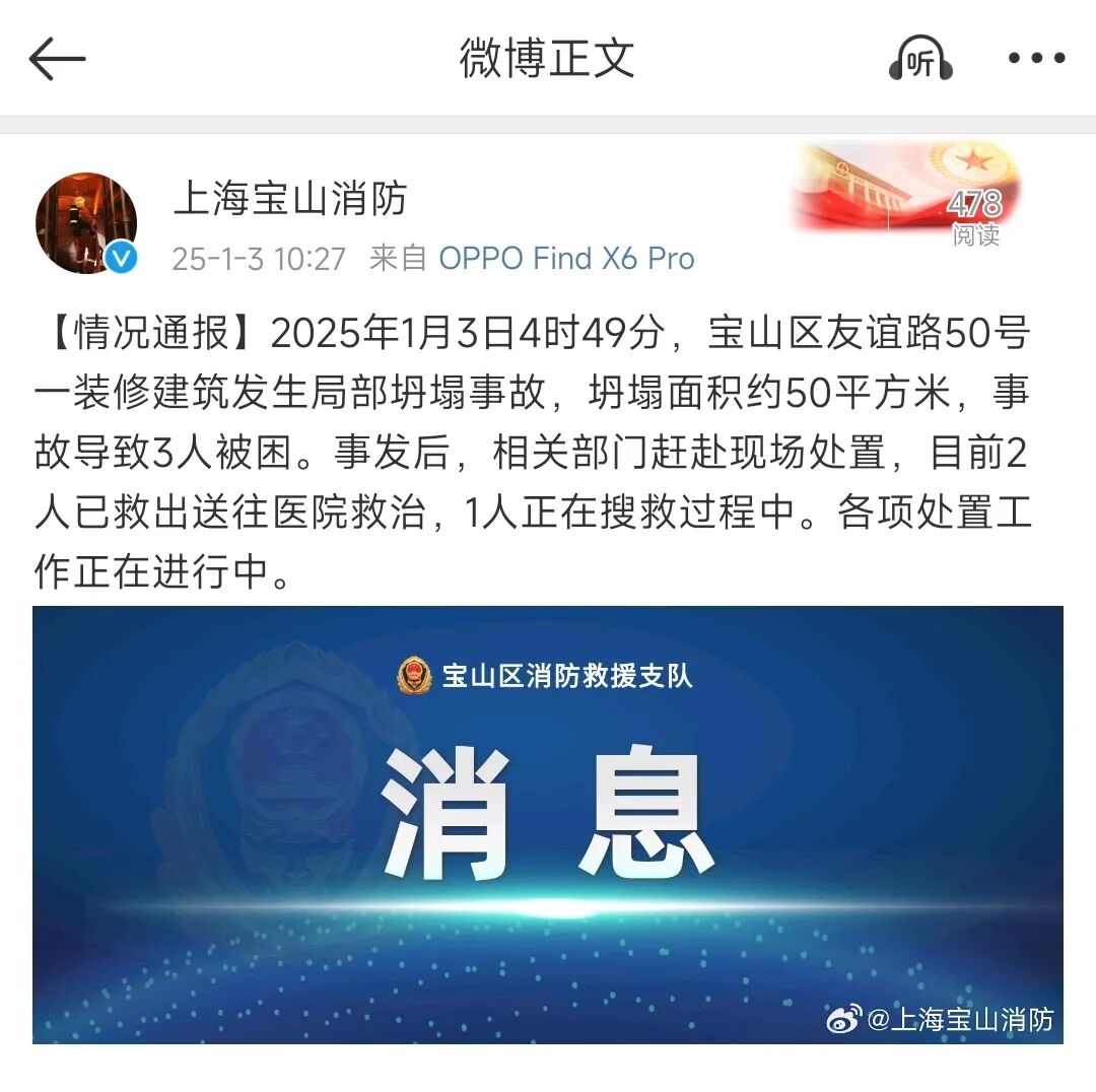 据上海宝山消防情况通报,1月3日4时49分,上海宝山区友谊路一装修建筑发生局部坍塌事故,事故导致3人被困。